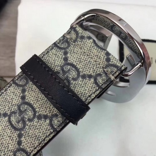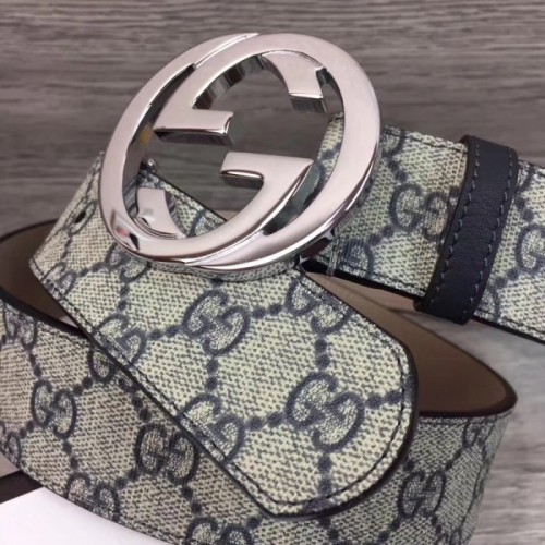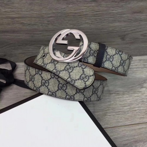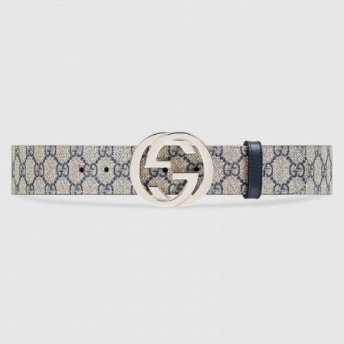 Our GG Supreme canvas is offered in a beige and blue combination, finished with an interlocking G buckle.
