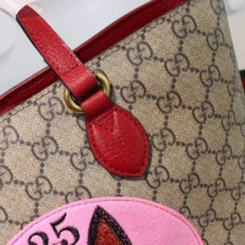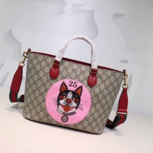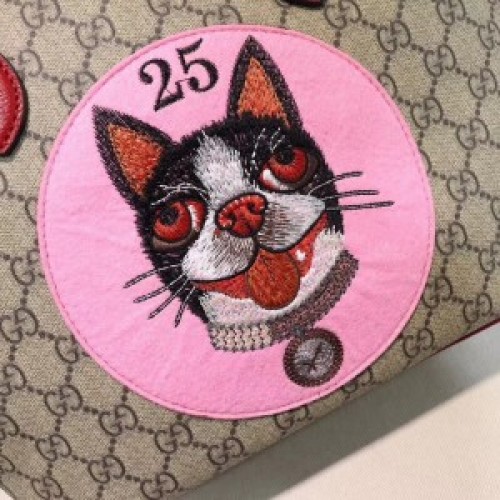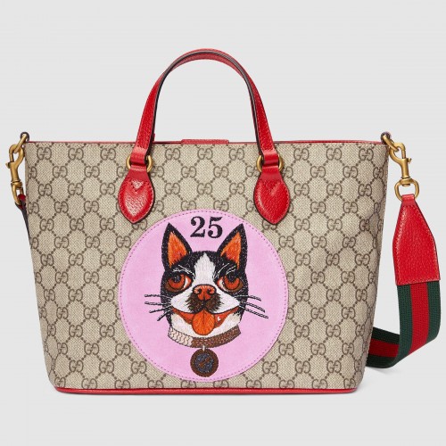 The GG Supreme tote features a suede patch embroidered with the image of Bosco, the Boston terrier. Depictions of the Creative Director's pets appear throughout the Cruise 2018 collectsion, connected to the Chinese calendar's year of the dog. Made in soft GG Supreme, a softer version of GG Supreme canvas, crafted from a coated microfiber fabric with the GG motif.
