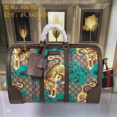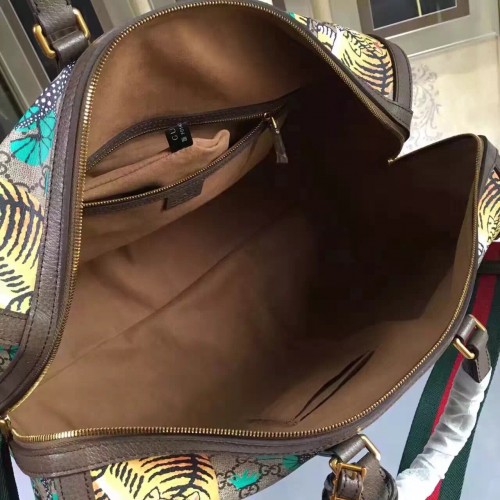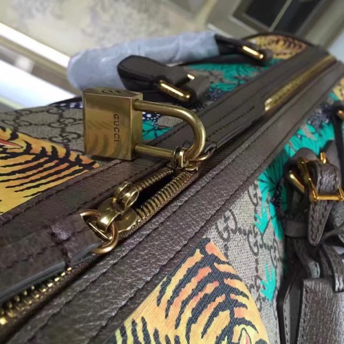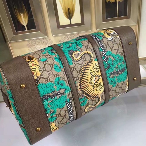 A medium size duffle in GG Supreme canvas with Gucci Bengal print, introduced for Cruise 2017. The print depicts tigers scattered amongst a colorful forest represented through brushstroke-style graphics to create a three-dimensional effect against the GG motif.