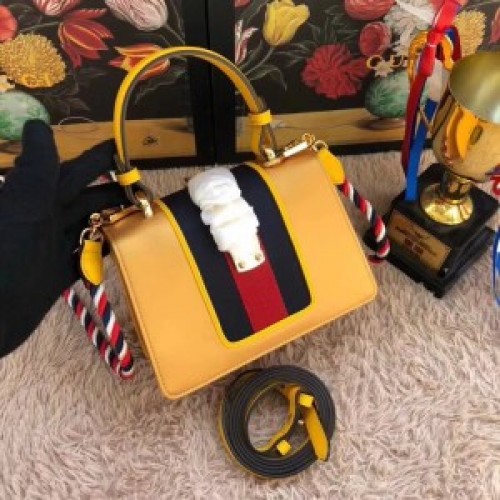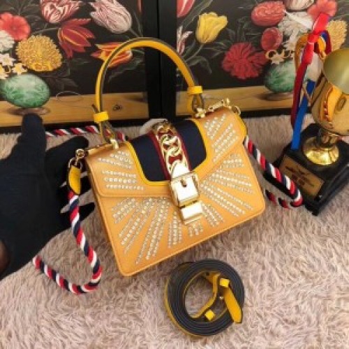 The Sylvie mini top handle bag in made from shiny satin, embellished with rays of sparkling crystals that radiate from the center buckle and Web. The nylon Web is embedded under the fabric and decorated with a gold chain and buckle taken from the House’s archives.