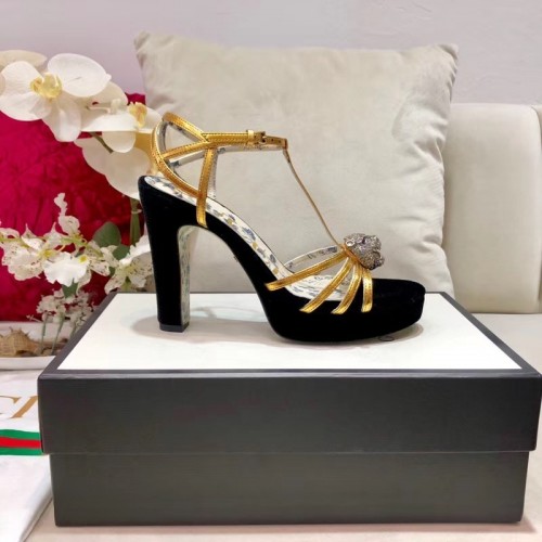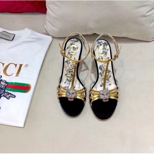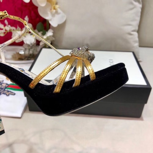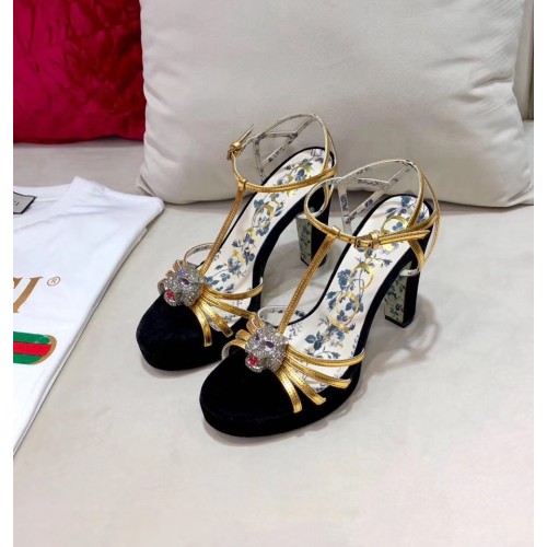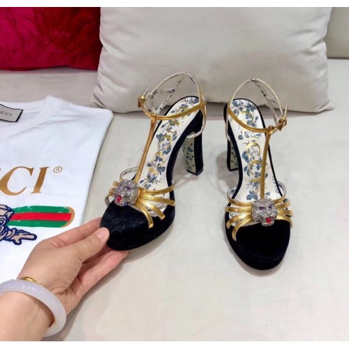 Gucci Heel 10.5cm Platform 2.5cm Feline Head Sandals Velvet Black/Gold 2019