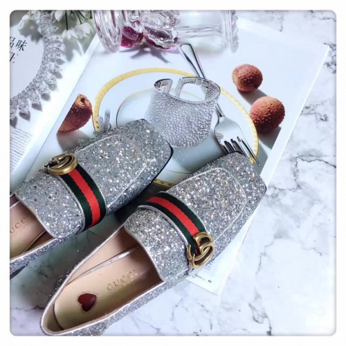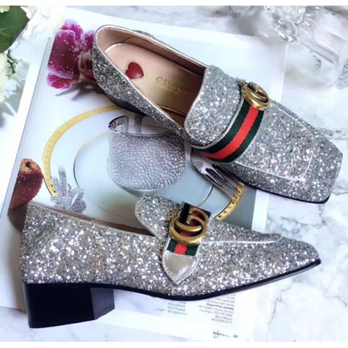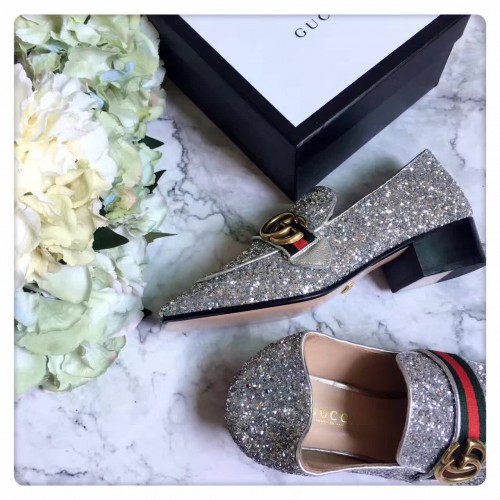 Gucci Heel 5cm Glitter Double G Square Toe Loafter 476726 Silver 2017