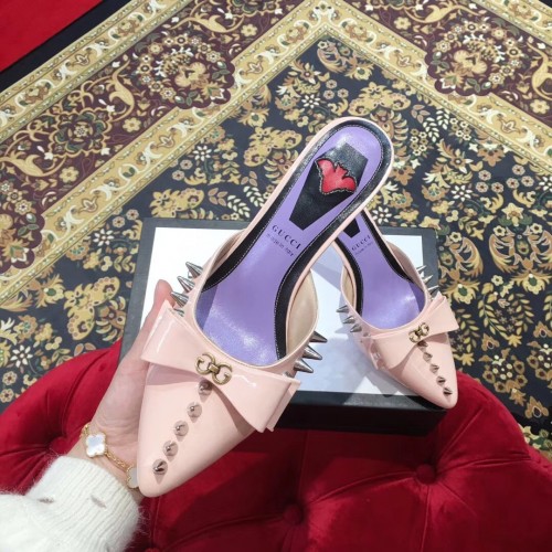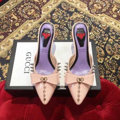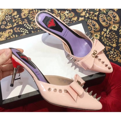 Gucci Heel 8cm Patent Leather Silver-toned Spikes Mules with Bow Nude Pink 2019