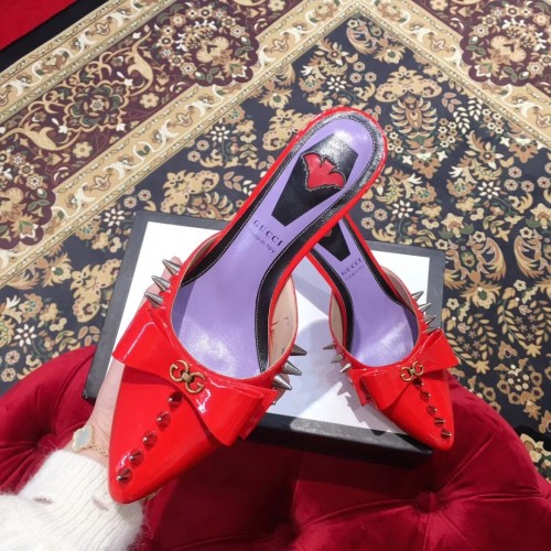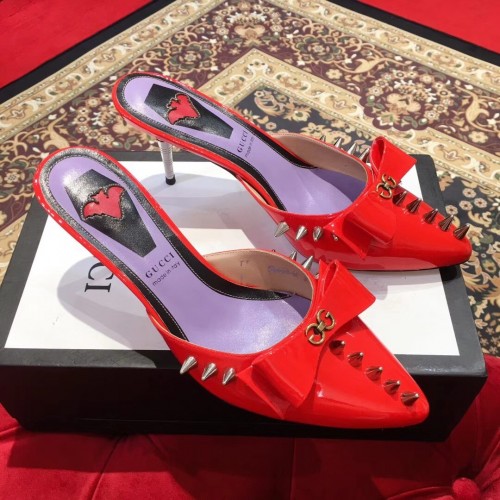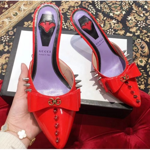 Gucci Heel 8cm Patent Leather Silver-toned Spikes Mules with Bow Red 2019