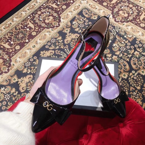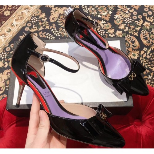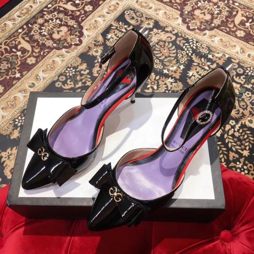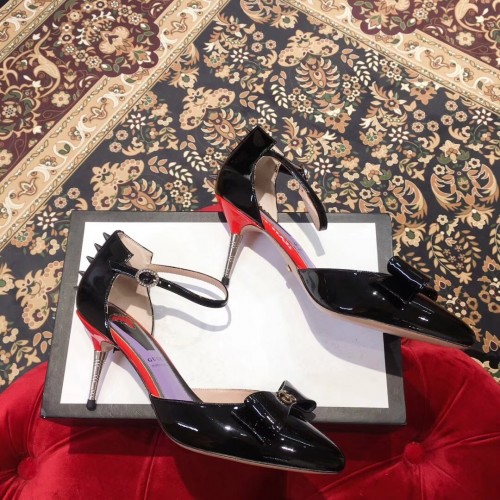 Gucci Heel 8cm Patent Leather Silver-toned Spikes Sandals with Bow Black 2019
