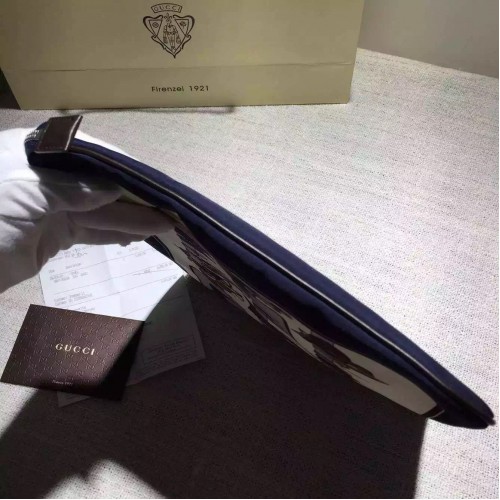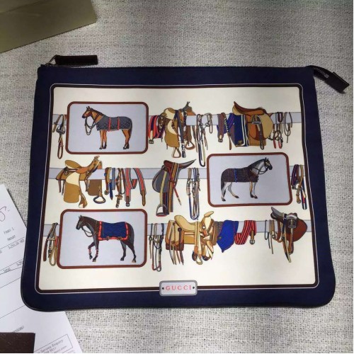 HORSE FRAME PRINT TRAVEL POUCH IN BLUESKU:ALV-1007SIZE:W34cm x H28cm This novelty travel pouch is crafted from a durable fabric printed with the season's signature horse frame motif, a pattern featured in the men's ready to wear collectsion and inspired by our archives.horse frame print nylonbrown leather pipingred cotton/linen lining100% polyamideprinted Gucci logo at the bottom of frametop zip closureinterior zip and open pockets388917 KQU1N 9261