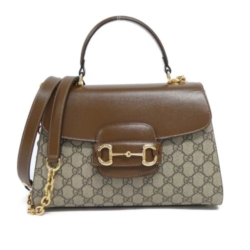 Tags: Gucci Horsebit 1955 Medium Top Handle Shoulder Bag In Beige And Ebony GG Supreme Canvas, ,