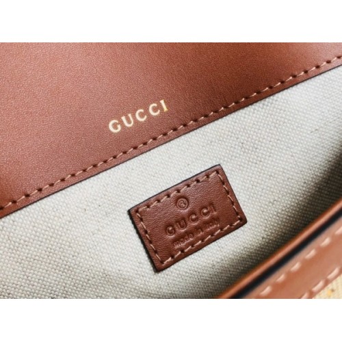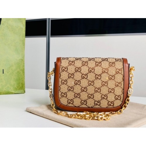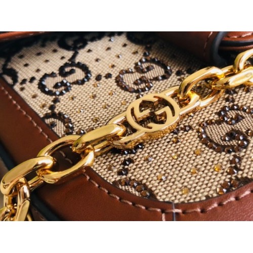 Presented in camel and ebony GG canvas, this bag is further enhanced by crystals. The structured shape and clean lines of the Gucci Horsebit 1955 highlights the collectsion's signature gold-toned hardware. Part of Gucci’s genetic code, the double ring and bar design has been established as one of the most distinctive elements among the House symbols borrowed from the equestrian world. A delicate chain strap with monogram details adds a refined note to the style.
