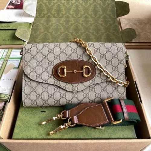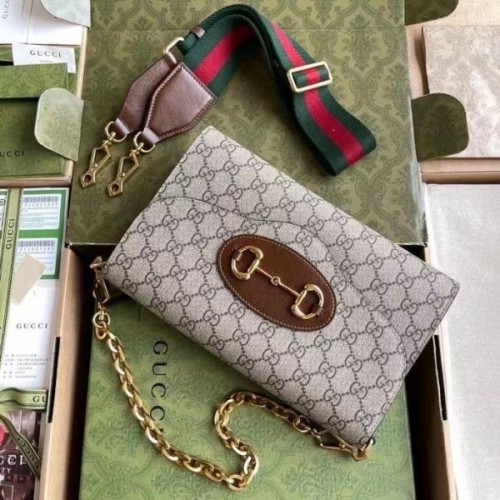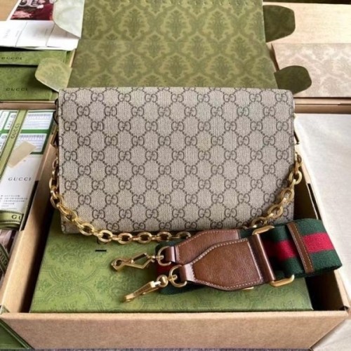 Embodying the notion of the versatility, the Gucci Horsebit 1955 is enriched with two detachable shoulder straps, one is crafted in emblematic green and red Web the other is in Gucci’s recognizable gold-toned chain design. The style is crafted from GG Supreme canvas and defined by the line's signature Horsebit hardware.