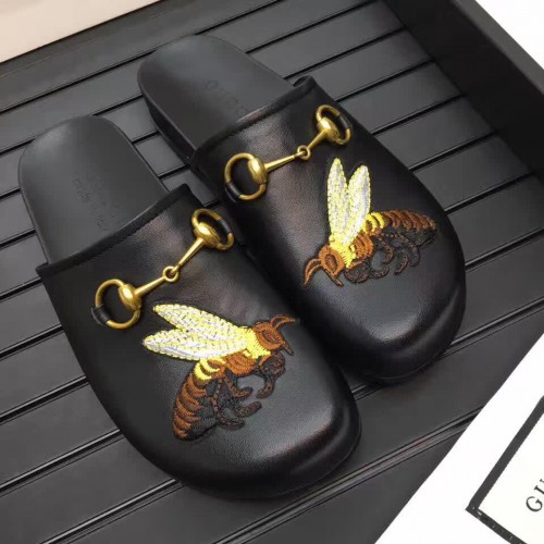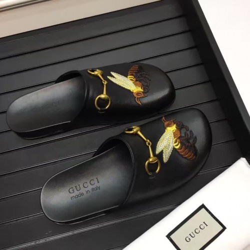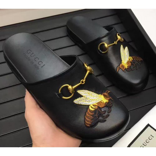 Gucci Horsebit Detail Embroidered Bee Leather Men's Slipper Black 2017