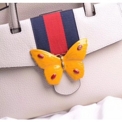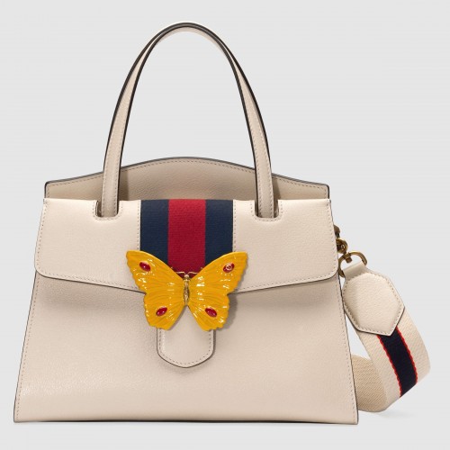 A symbolic emblem from the Gucci Garden, the butterfly has become synonymous with the House. The winged motif is interpreted for Cruise in metal with colorful enameled details. Placed on a leather top handle bag with House Web stripe, the design is completed with a Gucci jacquard stripe shoulder strap.