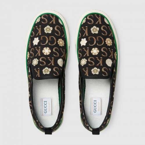 Part of the Gucci Tennis 1977 line, this slip-on sneaker is animated by a monogram print that mixies the initials of Ken Scott with flowers. Nicknamed the ‘Fashion Gardener,’ Ken Scott was an American designer who lived in Milan in the ‘60s and ‘70s and whose colorful floral drawings were reflective of his eclectic personality.