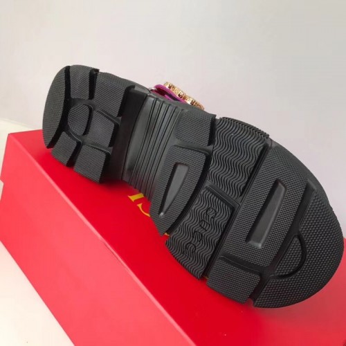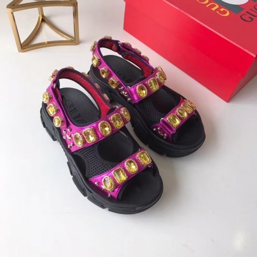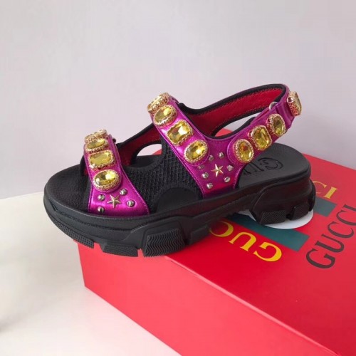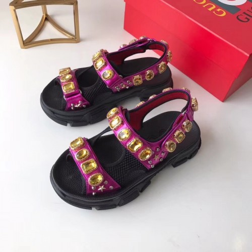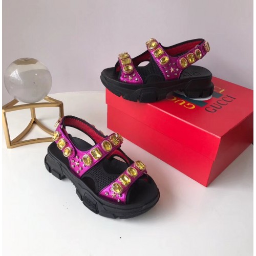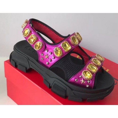 Gucci Leather And Mesh Sandals With Crystals 557471 Black/Metallic Fuchsia 2019
