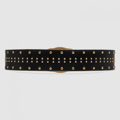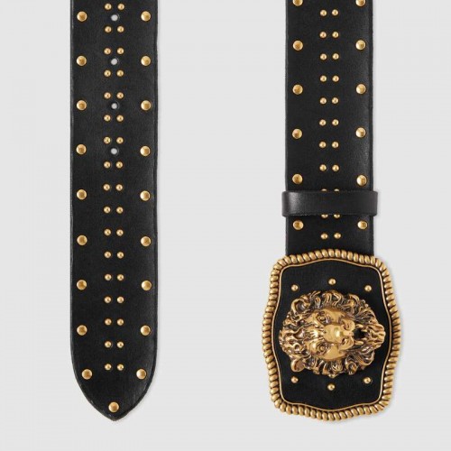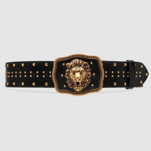 A snarling lion head defines this black leather belt. Accentuated by gold-toned studs and a textured metal frame, this accessory was part of a look that walked the Fall Winter 2019 runway under a kaleidoscope of lights and reflections.