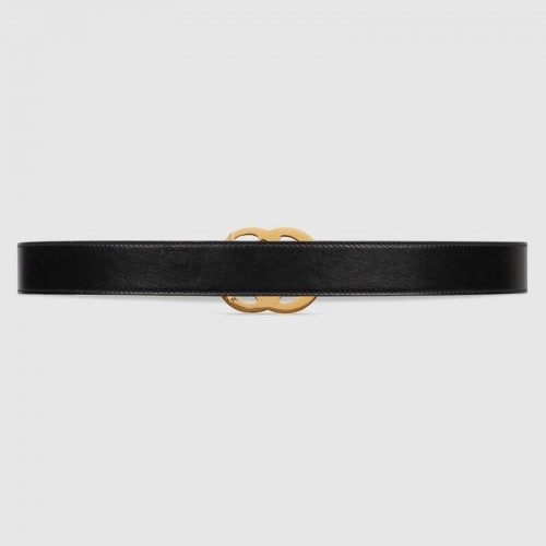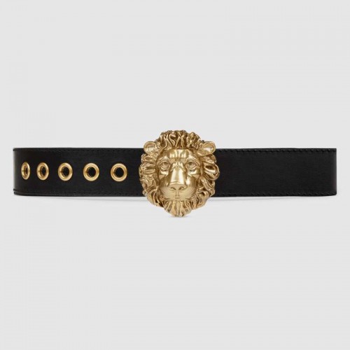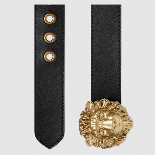 A new iteration of the lion head is introduced for Spring Summer 2020. The gold-toned symbol is set on a black leather women's belt with contrasting metal eyelets to highlight the belt holes.