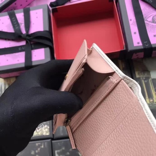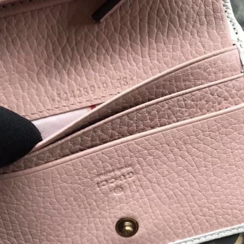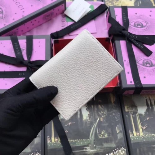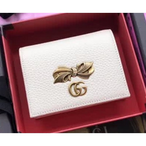 Metal studs in recognizable shapes, often inspired by the House's romantic narrative, are displayed throughout ready-to-wear and accessories. Here, a delicate bow in antique gold-toned metal encrusted with sparkling crystals decorates the front of a white leather card case. Light pink trims enhance the accessory's refined charm.