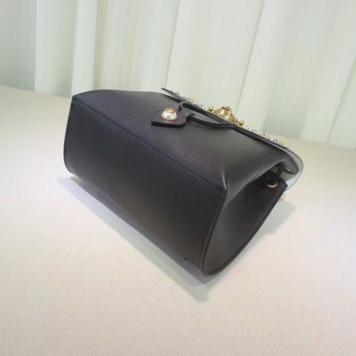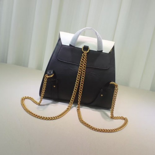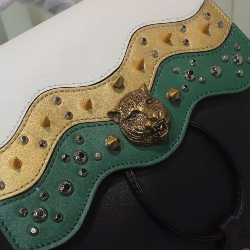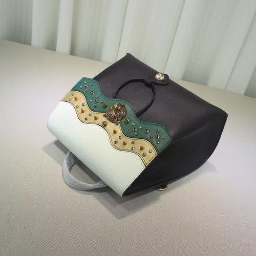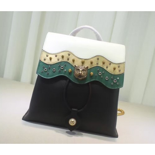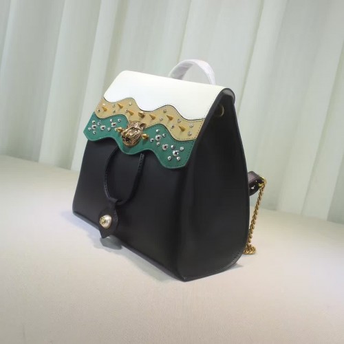 size:29*27*14 CM A leather backpack with chain straps and a multicolored wave flap decorated with different size and color studs. The now iconic feline head makes a statement on the front center. Black leather with emerald green/red, metallic gold and white leather in a wave pattern with studs Feline head Interior open and smartphone pockets Top handle Adjustable chain shoulder straps Magnet closure Antique gold toned and silver toned studs Made in Italy
