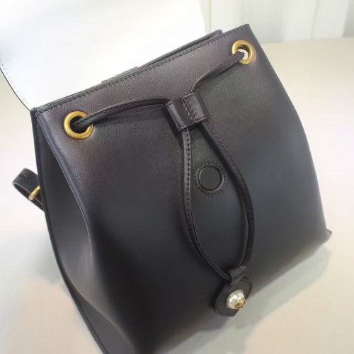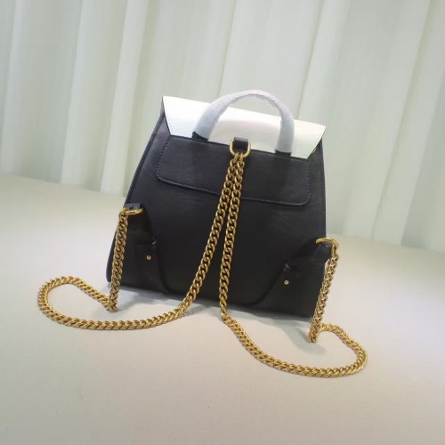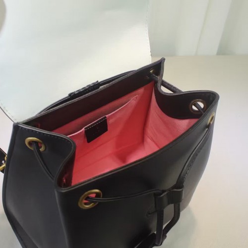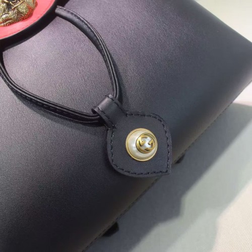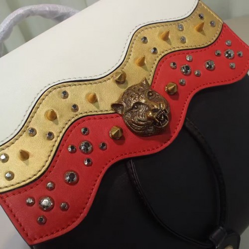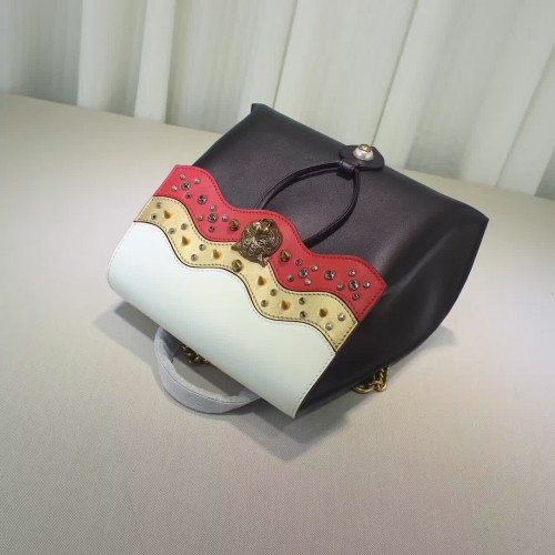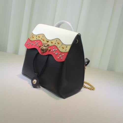 size:29*27*14 CM A leather backpack with chain straps and a multicolored wave flap decorated with different size and color studs. The now iconic feline head makes a statement on the front center. Black leather with emerald green/red, metallic gold and white leather in a wave pattern with studs Feline head Interior open and smartphone pockets Top handle Adjustable chain shoulder straps Magnet closure Antique gold toned and silver toned studs Made in Italy