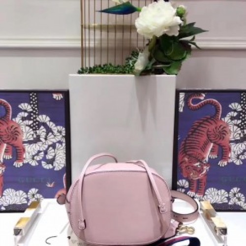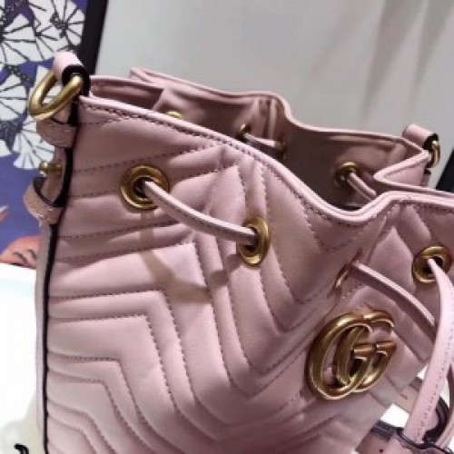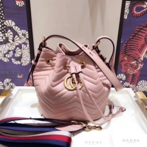 Gucci's 'Marmont' bag is instantly recognizable by its gold 'GG' plaque, and the brand introduces this new bucket style to the lineup. It's made from chevron leather that's expertly quilted in chevron stripes and embossed with a playful heart at the back. Carry yours by the top handle or wear it cross-body using the blue, red and white striped shoulder strap.
