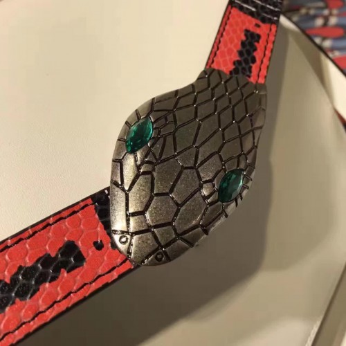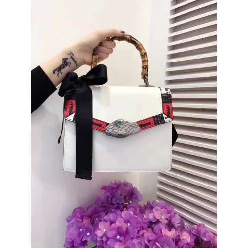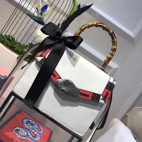 ---A small leather top handle bag with printed snakeskin detail along the flap and snake head closure. The snake is often associated with the image of Lilith, who in mythology is thought to have been the first wife of Adam and later, a demon. The textured snake head has crystal stones set in the eyes. The bag is further enhanced with a bamboo top handle and black grosgrain bow detail. Made in smooth leather.