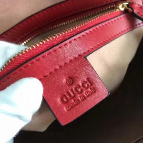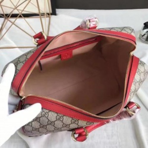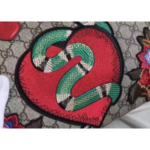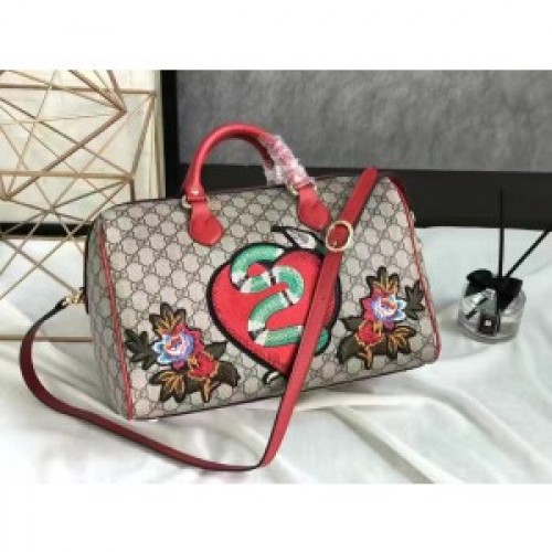A special limited edition boston bag, featuring red leather trims and embroideries on GG Supreme. The appliqués feature a Kingsnake and heart and flowers embroideries.