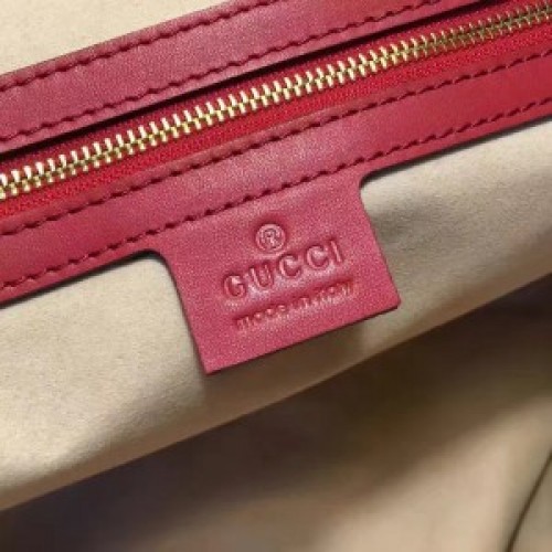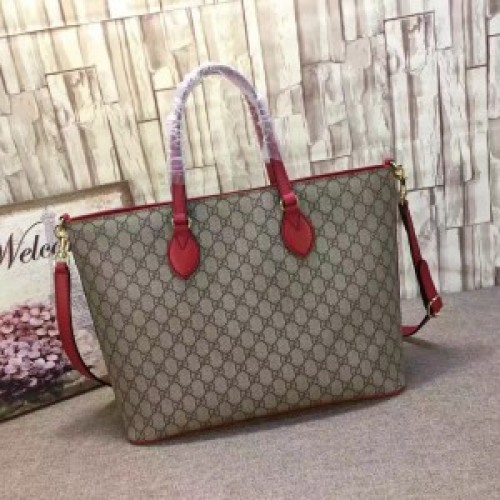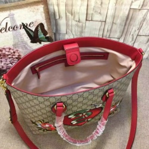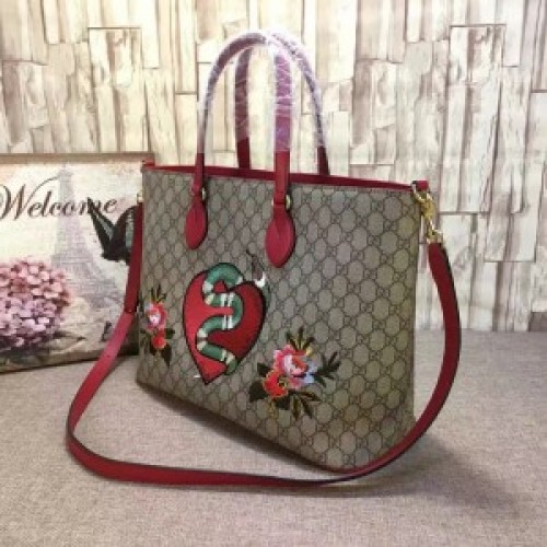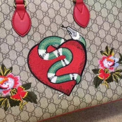 A special limited edition tote, featuring red leather trims and embroideries. Made in soft GG Supreme, a softer version of GG Supreme canvas, crafted from a coated microfiber fabric with the GG motif. The appliqués feature a Kingsnake, heart and flowers embroideries.