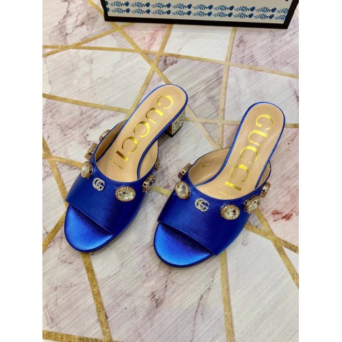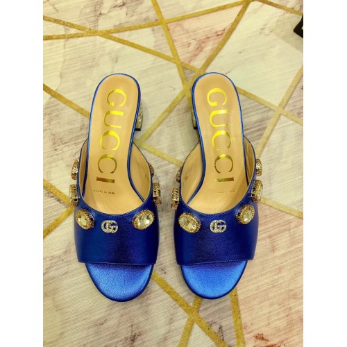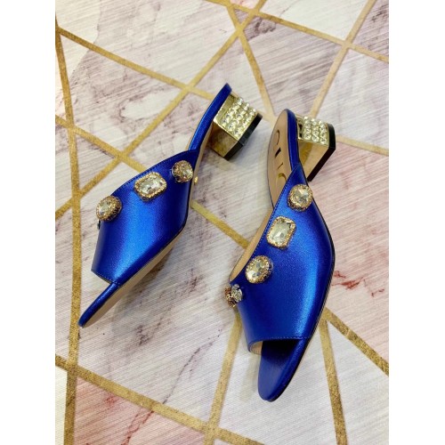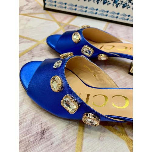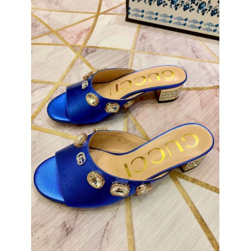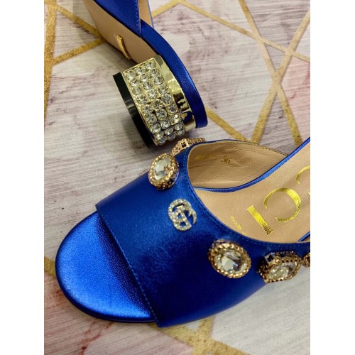 Gucci Lyric GG Crystal Embellished Heel Moire Mules Blue 2019