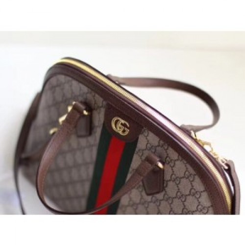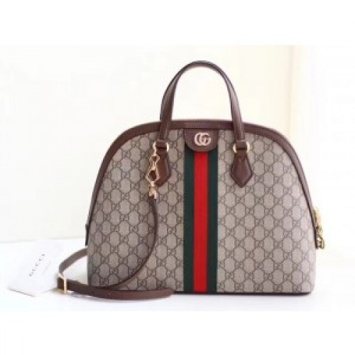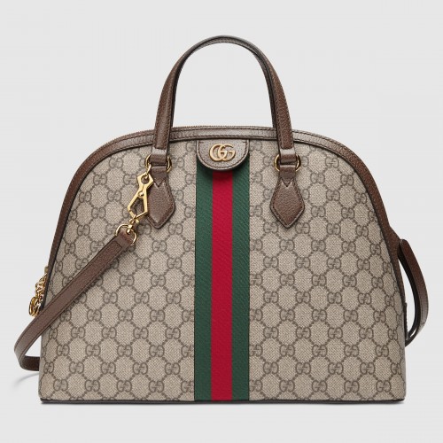 The world of Ophidia evolves with the introduction of this medium top handle bag crafted in GG Supreme canvas with inlaid green and red Web stripe. Defined by a domed shape that recalls vintage designs, the accessory is enhanced by a petite play on the Double G, an archival Gucci code from the 70s that appears atop a leather tab detail and on the zipper pull. The bag is completed with a detachable shoulder strap which allows it to be carried in multiple ways.
