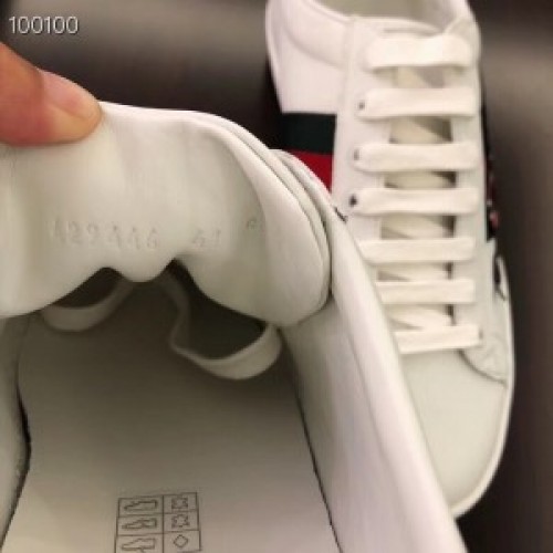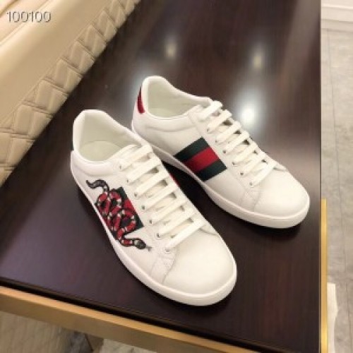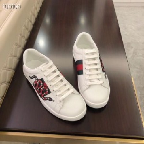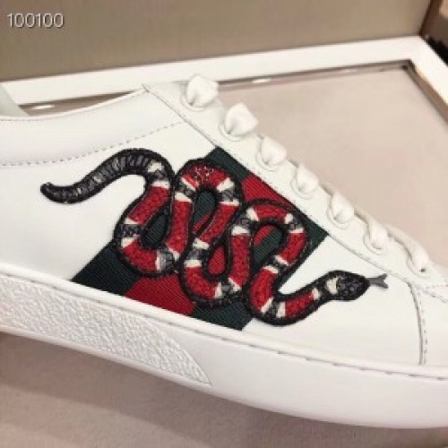 Spliced with signature webbings through the sides, the Gucci New Ace sneakers are a contemporary take on the brand's storied Italian heritage. A classic low-top style, they boast a lace-up silhouette in smooth leather, trimmed with the hallmark Web stripe and an embroidered snake appliqué.