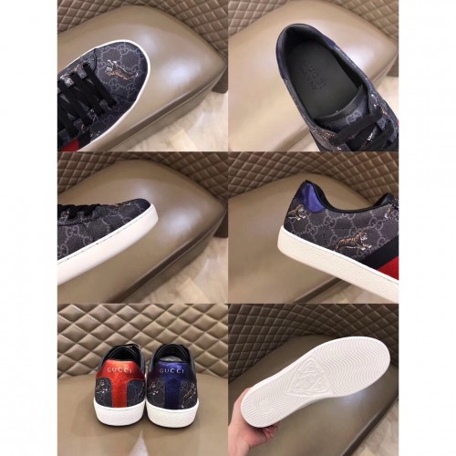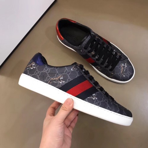 Leaping tigers are scattered across a GG Supreme base, contrasting against the black and grey combination of the emblematic House pattern. The distinctive Ace silhouette is completed with the blue and red Web stripe and a different colored metallic leather heel on each shoe.