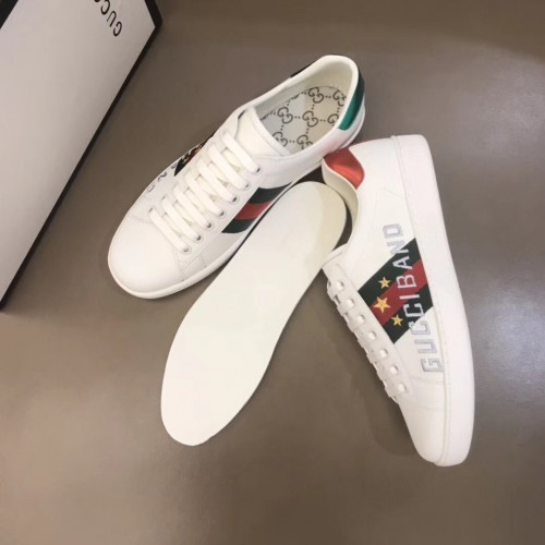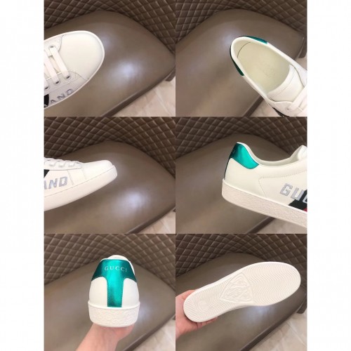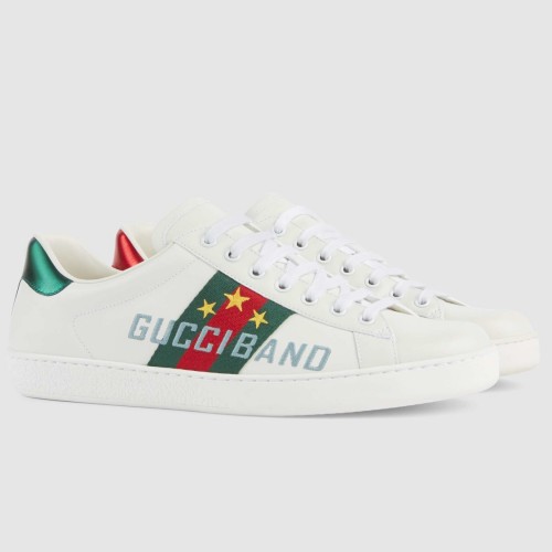 The House's classic sneaker is presented for Cruise 2020 in white leather featuring the Web in its signature color combination of green and red. The "Gucci Band" motto, a recurring phrase of the collectsion, is matched with stars, standing for a community that brings together different cultures and personalities.