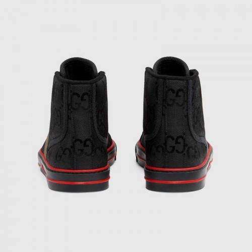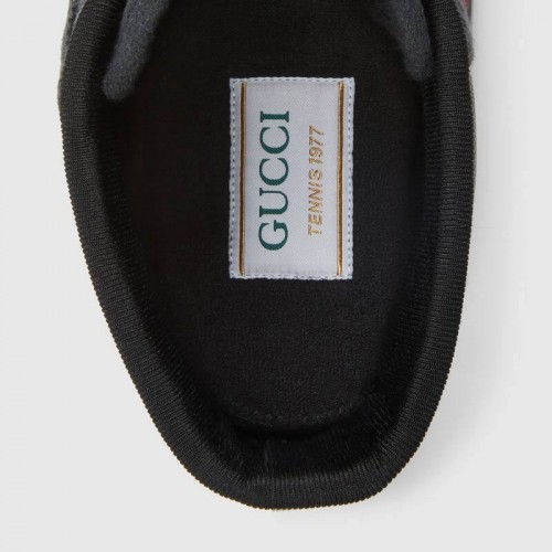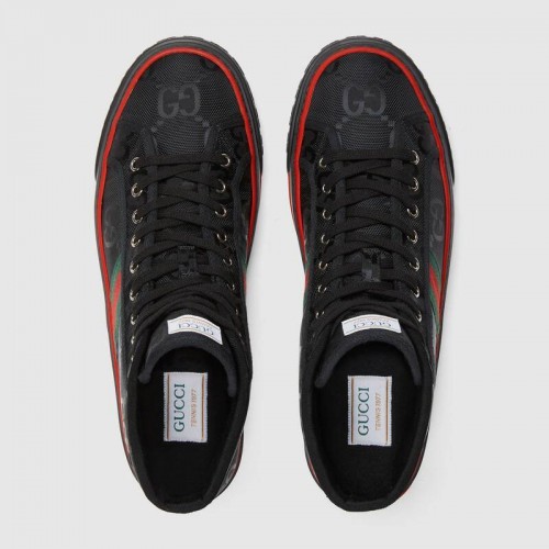 Part of the Gucci Tennis 1977 collectsion, the high-top sneaker is introduced within a line of accessories and ready-to-wear presented for Pre-Fall 2020 made from recycled materials and trims, supporting the House's commitment to sustainability. Gucci Off The Grid is the first collectsion from Gucci Circular Lines—a concept created to support the House's vision for circular production. Designed for those mindful of their environmental impact, Gucci Off The Grid uses recycled, organic, bio-based and sustainably sourced materials. Regenerated nylon, crafted using recycled sewing thread and trims displays the GG pattern against an opaque background in black.