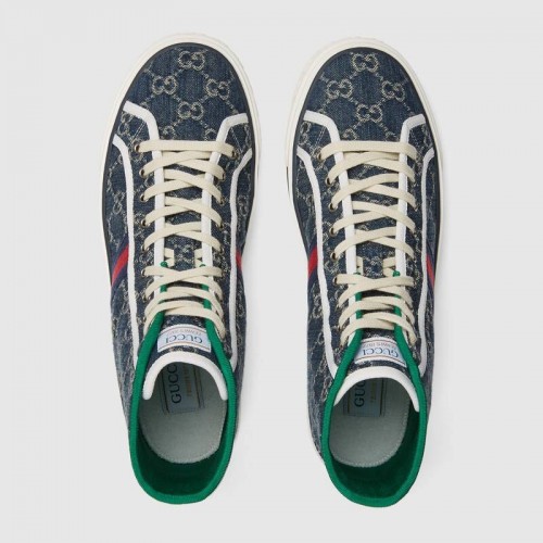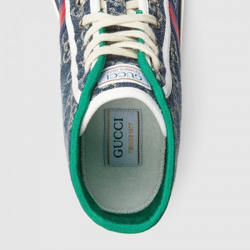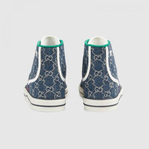 Presented in eco washed organic jacquard denim, the Gucci Tennis 1977 pays tribute to different eras of Gucci's history. Recalling the brand's connection to the world of sports and leisure the House Web decorates the side of the high-top sneaker. An emblematic code that can be traced back to the very start of the brand, Guccio Gucci's monogram defines this style as an all over motif and raised pattern on the sole.