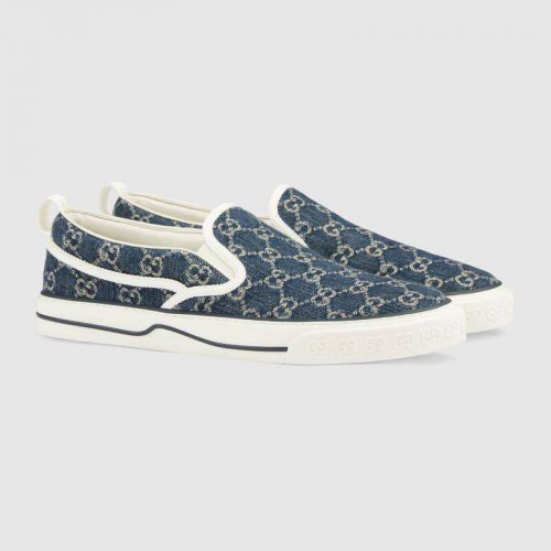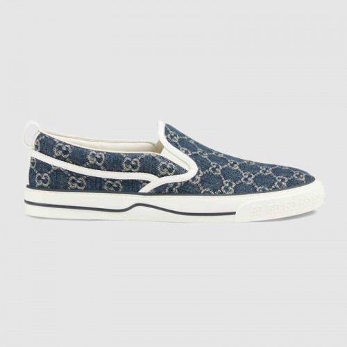 Presented in an eco washed jacquard denim, a slip-on version of the Gucci 1977 sneaker has a strong logo feel. Decorated with the GG motif the shoe pays tribute to the Founder of the brand, Guccio Gucci. The style is finished with a chunky rubber sole with a tonal stripe.