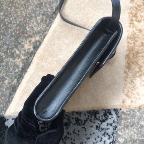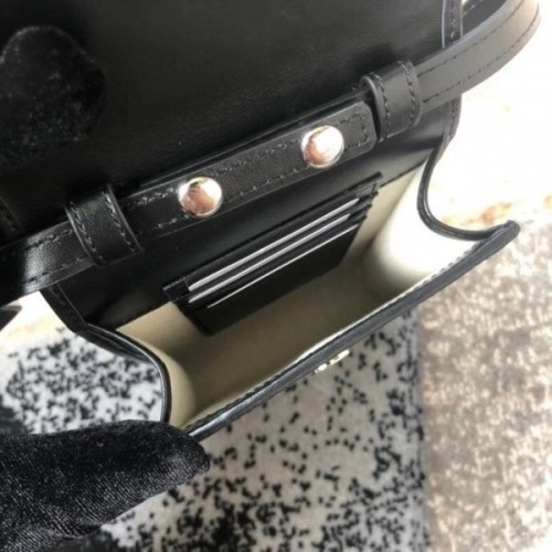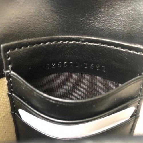 Presented in a petite rectangular shape, the mini bag offers a functional design with three interior card slots and a shoulder strap. A play on texture, the GG leather—noted for its softness and slightly shiny finish—features the embossed House emblem on a black perforated leather base. The strap detail gives it a multifunctional appeal, allowing it to be worn around the neck as a necklace.