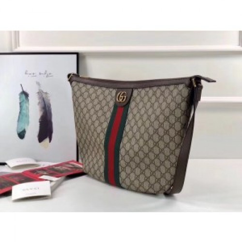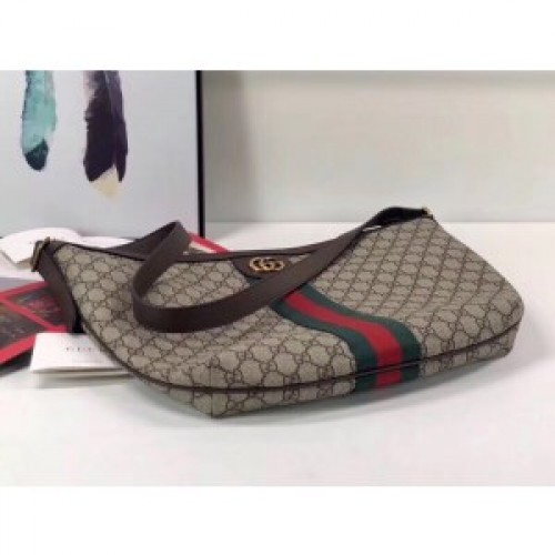 A classic combination of the House's most recognizable elements—the GG motif and Web stripe—the world of Ophidia continues to evolve, incorporating new shapes and silhouettes. The half-moon design mixes emblematic references with the unique charms of the hobo bag, a popular Gucci model since the late '50s. Crafted in GG Supreme canvas, it's trimmed with textured leather and topped with Double G hardware.