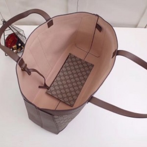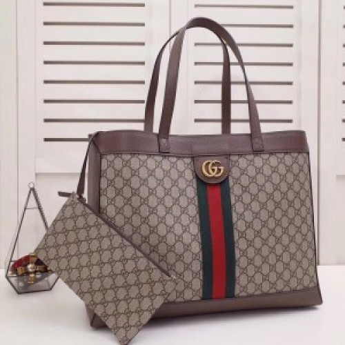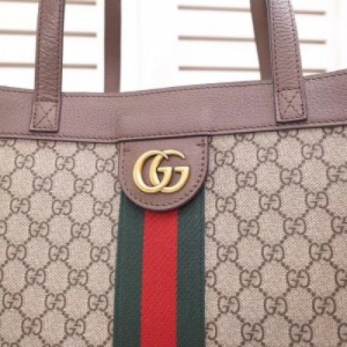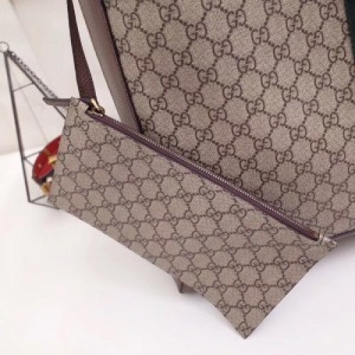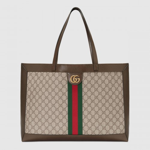A classic combination of the House's most recognizable elements—the GG motif and Web stripe—the world of Ophidia continues to evolve, incorporating new shapes and silhouettes. The wide tote is made from supple soft GG Supreme canvas, trimmed with textured leather and topped with Double G hardware.