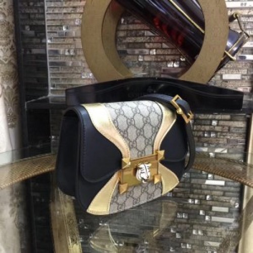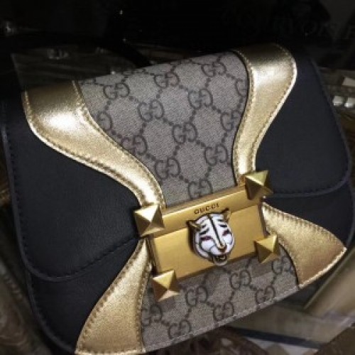 An archival inspired metal lock closure is set atop the shoulder bag with an enameled feline head with red Swarovski eyes. Crafted in GG Supreme canvas, the bag is trimmed with black leather and features an abstract design highlighted with metallic gold fabric edges.
