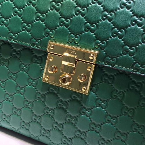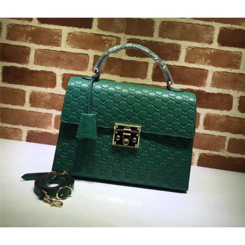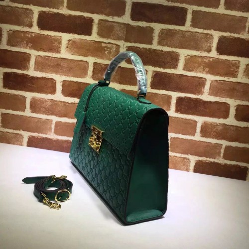 size:35*25*11 cmA new shape from the Padlock collectsion, this medium size top handle bag has our key lock closure pulled straight from the archives, the key is placed in a leather key case that loops around handle. Made in heat debossed Gucci Signature leather resulting in a defined print with a firm texture.Emerald Gucci Signature leatherKey with leather holderOne side gussetFive metal feetInterior zip and smartphone pocketsExterior pocketTop handle Detachable shoulder strap Lock closureMediumCamel microfiber lining with a suede-like finishMade in ItalyGold toned hardware