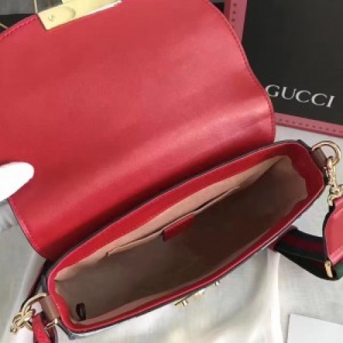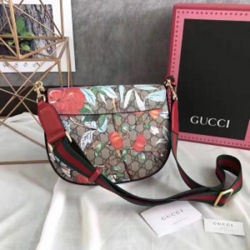 Alessandro Michele combines the classic brown ‘gg’ Supreme logo pattern with SS17’s eye-catching Tian print to provide the ultimate day-to-night accessory. Designed in Italy, the light-weight piece boasts a curved silhouette with a front flap closure, a gold-tone lock detailing, a removable shoulder strap and a hanging leather luggage tag. The interior is practical and spacious, while the striking pattern is complimented by Gucci’s iconic green and red Sylvie web trimming.