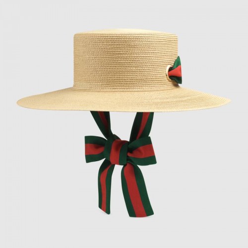 A wide brim hat crafted from ivory papier. The accessory is completed by a green and red Web ribbon which can be tied under the chin.