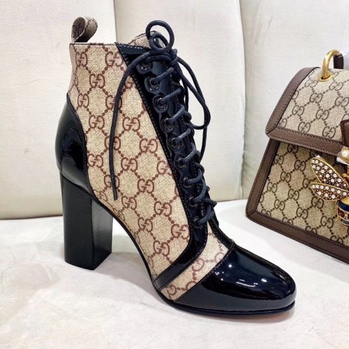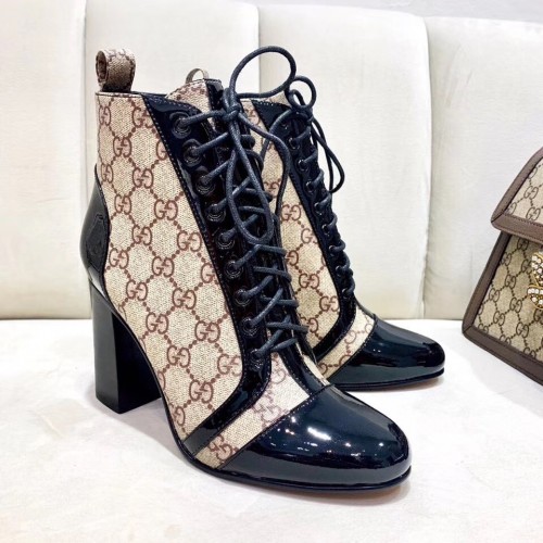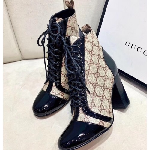 Gucci Patent Black Lace-up Ankle Boots GG Beige 2019