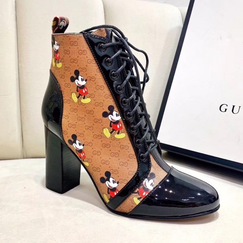 Gucci Patent Black Lace-up Ankle Boots GG Khaki Mickey Mouse 2019