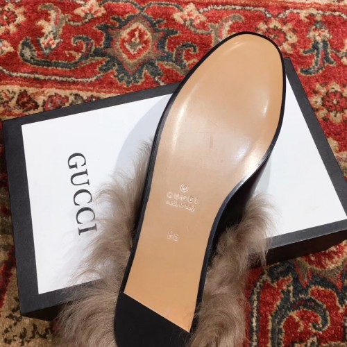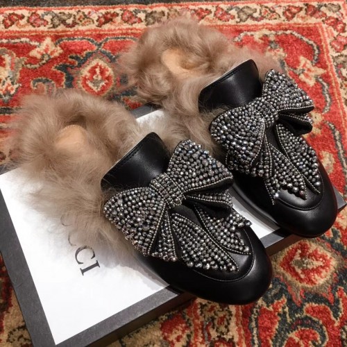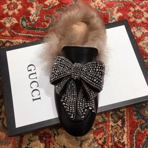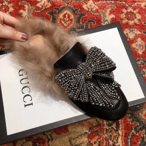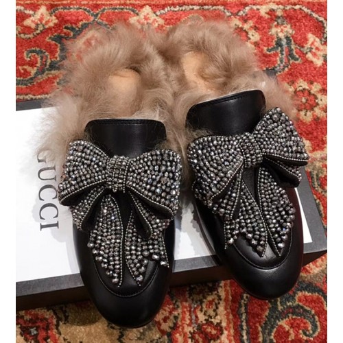 Gucci Princetown Crystal Embroidered Bow With Lamb Fur Slipper Horsebit Detail 471955 Black