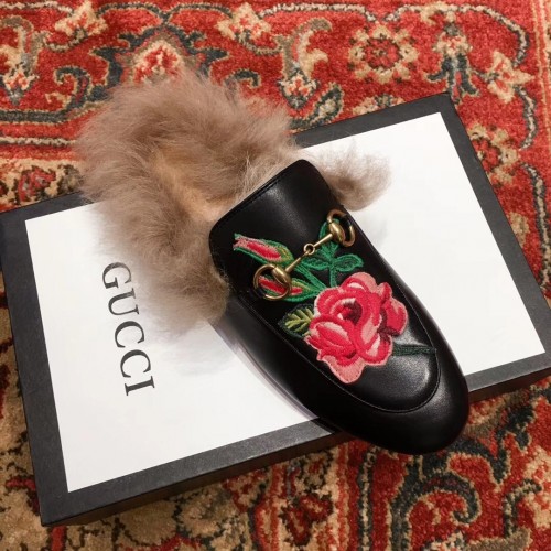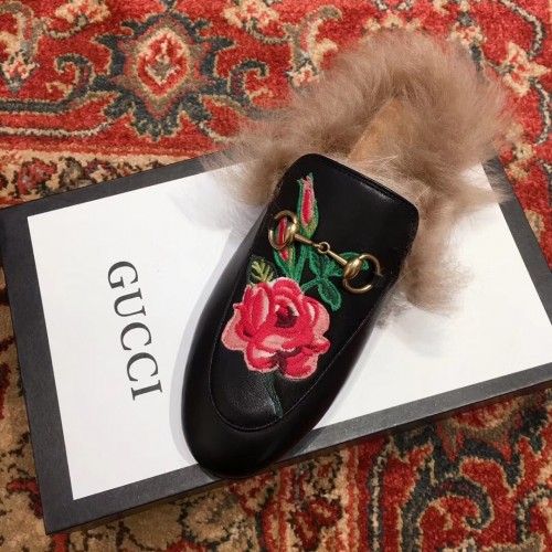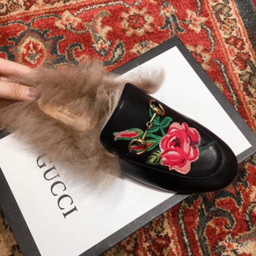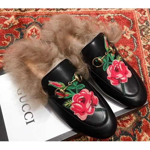 Gucci Princetown Leather Fur Slipper Black Flowers