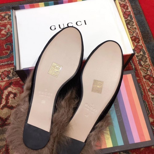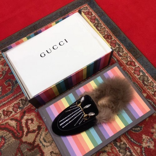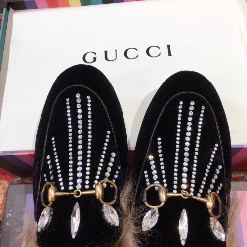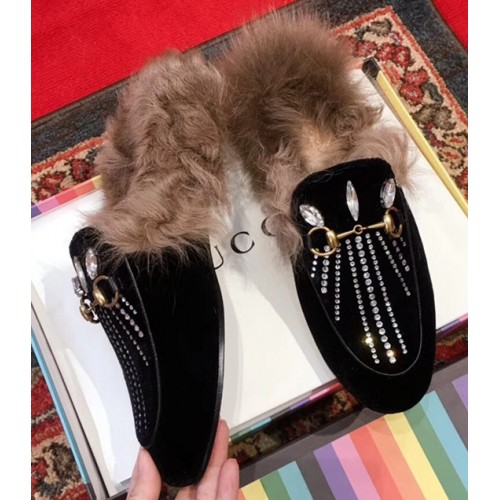 Gucci Princetown Velvet Fur Slipper With Crystals Black