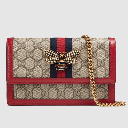 An eclectic mixture of historical Gucci details and newly established codes, for the Pre-Fall 2018 the Queen Margaret line evolves with the introduction of a mini bag. Presented in GG canvas, a versatile fabric that continues to pay homage to the House's roots, the accessory is enriched by a metal bee adorned with glass pearls and multicolor crystals—a precious play on an archival symbol from the 70s.