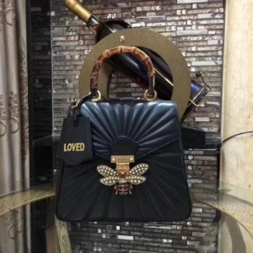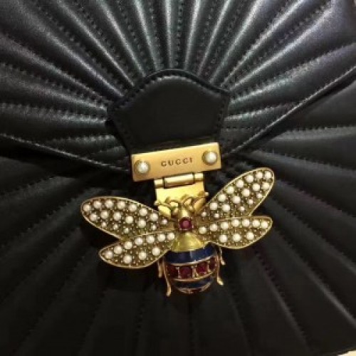The Queen Margaret line mixes iconic Gucci details with newly established codes. The bee-a historical Gucci code taken from the '70s archives-is enriched by glass pearls and multicolor crystals. An ID holder with gold embossed "Loved", a reference to inclusive romanticism, hangs over the iconic bamboo handle. Made in a soft quilted leather.