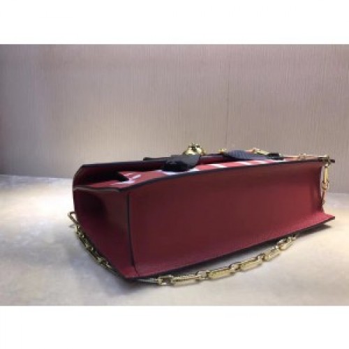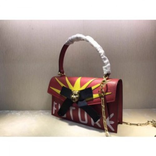 Gucci’s ‘Osiride’ handbag silhouette made its debut on the SS17 runway, crafted in Italy from textured red calf leather with a natural grain. The bag is punctuated with a signature Alessandro Michele black grosgrain bow, an iconic gold-tone feline embellishment and the word ‘Future’ in white printed across the bottom – a word used throughout the collectsion to emphasize the importance of now. The eye-catching piece boasts a foldover top with a snap fastening, a front pocket, an internal slip