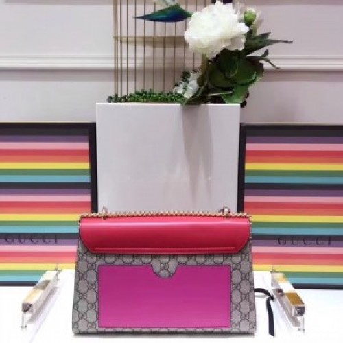 This medium-sized Padlock GG Supreme is structured to perfection, with a leather top and key lock closure which secures all of your stuff in style. Its sliding chain strap can be worn into multiple styles, which renders it as a very versatile piece! Top handle or shoulder bag, it’s there to bring you a billion style points.
